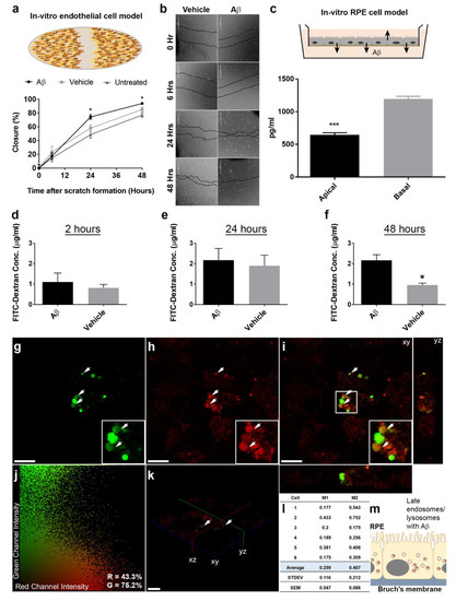 Human oligomeric Aβ1-42 directly targets choroidal endothelial and RPE cells. (a) The consequences of Aβ exposure on choroidal endothelial cells were studied using a scratch assay. (b) Representative bright filed images showing closure of the scratch between 0, 6, 24 and 48 h after treatment with either 1 μM of human oligomeric Aβ1-42 or vehicle. Exposure to Aβ resulted in a significantly rapid closure of the scratch at 24 and 48 h compared to vehicle or untreated controls (n = 4). One-way ANOVA with Tukey’s multiple comparisons test, where * denotes a significance of p ˂ 0.05. (c) As the RPE is a major source of retinal Aβ, we next quantified total soluble Aβ1-x levels in an in vitro model. Significantly higher amounts of Aβ was preferentially secreted via the basolateral RPE surface compared to Aβ levels secreted apically (n = 3 from 3 independent experiments). Unpaired Student’s t-test, where *** denotes a significance of p ˂ 0.001. To determine whether exposure to elevated Aβ impaired integrity of the RPE barrier, we quantified the passage of a FITC-dextran substrate from the apical to the basal Transwell chamber at (d) 2 h, (e) 24 h and (f) 48 h. Exposure to 1 μM human oligomeric Aβ1-42 resulted in a markedly increased paracellular permeability at 48 h compared to vehicle-treated controls (n = 3). Mann–Whitney U test where * denotes a significance of p ˂ 0.05. Next, we studied whether exposure to Aβ resulted in its internalization by RPE cells. Representative confocal micrographs showing (g) Alex Fluor 488-tagged Aβ1-42 (green) with (h) LysoSensor DND-160 (red) (i) co-localizing in merged en face image (yellow: in white arrows) 24 h after Aβ exposure. Orthogonal views are shown alongside. Scale bars correspond to 40 μm. (j) Representative 2D scatter plot (cell 2 in (l)) generated by Costes analysis where thresholds are indicated in black along an axis providing a qualitative indication of co-localization. Manders split coefficients are shown in the bottom right. (k) 3D projection of cultured RPE cells showing Alex Fluor 488-tagged Aβ1-42 in green co-localizing with LysoSensor probe in red. Scale bar corresponds to 40 μm. (l) Costes overlap coefficients M1 and M2 indicating percentage of red co-localizing with green, and green co-localizing with red, respectively. Therefore, ~26% (0.259) of lysosomes were positive for Aβ, whilst 40.7% (0.407) of the Aβ signal co-localized to lysosomes. Measurements in n = 6 cells across three fields of view. Quantification was performed using Volocity software. (m) Schematic showing late-endocytic perinuclear compartments in RPE cells, which were labelled with Aβ1-42 in these experiments.