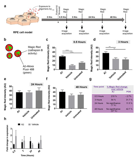 The cellular response to Aβ cargos in RPE lysosomes and transcriptional assessment of cathepsin B activity. (a) Schematic showing experimental plan where cultured RPE were exposed to 1 μM oligomeric Aβ1-42 for 3 h, following the removal of which Magic Red was used to obtain readouts of lysosomal cathepsin B activity at different time points. (b) Schematic showing arrangement of fluorophores in experiment where Aβ-Alexa Fluor 488 (green) and Magic Red (cathepsin B enzymatic activity) can be simultaneously quantified. Time course showing intensity of Magic Red fluorescence at (c) 0.5 h, (d) 3 h, (e) 24 h and (f) 48 h following exposure to Aβ, vehicle or untreated controls. Significant differences were observed in Magic Red intensity between Aβ vs. vehicle-treated controls as well as untreated sister cultures at 0.5 and 3 h, which diminished thereafter to baseline levels. n = 40 for Aβ1-42, vehicle and n = 30 for untreated cultures across four biological replicates (10 images analyzed per treatment/experiment). Kruskal–Wallis with Dunn’s multiple comparisons where ** denotes a significance of p ˂ 0.01, whilst **** indicate p ˂ 0.0001. (g) A summary table showing Magic Red activity in response to Aβ cargo as a percentage change over vehicle, compared to responses for POS cargo. (h) Quantitative PCR analysis of cathepsin B (CSTB) mRNA expression in relation to the EIF4A2 reference gene as fold change in expression, n = 3. No significant differences in cathepsin B mRNA levels were detected between Aβ-treated vs. vehicle or untreated cultures.