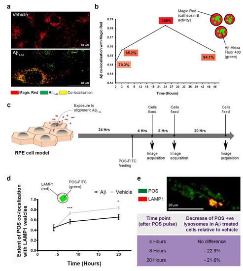 The daily internalization and proteolytic processing of POS is a key feature of RPE cells [1,40]. We therefore studied whether Aβ could affect the ability of RPE to handle POS cargos. Cultures were treated with vehicle or human oligomeric Aβ1-42, 24 h after which they were fed with POS, in keeping with the diurnal cycle (Figure 8c). We then used the algorithm utilized in previous studies [30] to quantify the extent of fluorescent POS molecules co-localizing with the lysosome associated membrane protein 1 (LAMP1) vesicles [41] (Figure 8d). Following POS feeding, quantification was carried out at key time points known to include early, mid and terminal phases of POS digestion [29]: 4 hours: 0.4 ± 0.03 SEM (vehicle) and 0.4 ± 0.06 SEM (Aβ); 8 hours: 0.73 ± 0.03 SEM (vehicle) and 0.6 ± 0.04 SEM (Aβ); 20 hours: 0.8 ± 0.03 SEM (vehicle) and 0.7 ± 0.05 SEM (Aβ). Two-tailed unpaired Student’s t-test. Although no differences were noted at the initial 4 h time point, a significant reduction in the number of lysosomes participating in POS handling was observed at 8 and 20 h in cultures exposed to Aβ (Figure 8d,e and Figure S12). These findings revealed a previously unreported mechanism through which Aβ can impair POS trafficking in RPE cells.