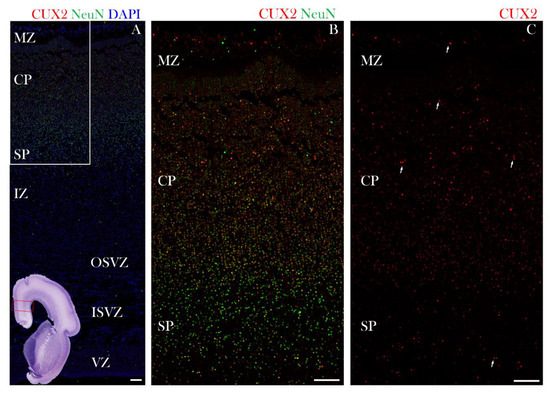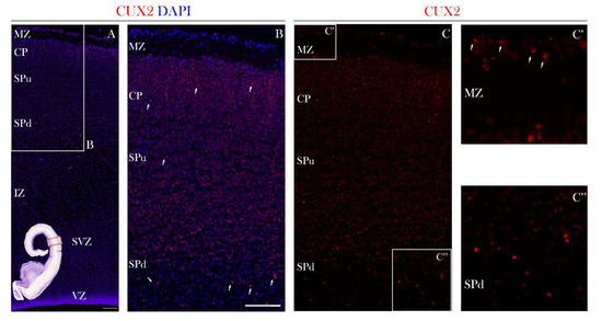 Figure 3. CUX2 is expressed in the MZ, superficial CP, and both upper and deep SP during the SP formation phase at 13 PCW. (A,B,C) Representative images of coronal section through the prospective dorsolateral frontal cortex (indicated by box in the Nissl stained complete scan of the coronal section in the lower left corner), was immunostained for CUX2 (red) and DAPI (blue) during formation of the SP phase at 13 PCW (C) CUX2+ nuclei (white arrows) were found to be scattered in the MZ (C’), superficial CP, upper SP (SPu; SP in formation), and had strong reactivity in the deep subplate (SPd) (C’’).