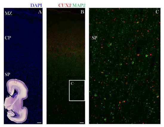 Figure 5. CUX2+ nuclei co-localize with MAP2 immunopositive neurons in the SP during the midgestation stationary phase at 21 PCW. Representative confocal images of the lateral dorsal part of the cerebral cortex in the prospective precentral area (indicated by red box on the inset representing complete scan of coronal Nissl section shown in lower left corner) is shown on the following sections (A,B,C). Developing neocortex was immunostained for CUX2 (red), neuronal marker MAP2 (green) and DAPI (blue). (A,B) The cell dense CP (A) contains CUX2+ nuclei in the mid third of the CP (B). MAP2 co-localizes with CUX2+ nuclei during the midgestation phase in the MZ, CP, and SP. (C) Higher magnification of box in B shows that a portion of MAP2+ neurons are also CUX2+ cells in the SP (C). Scale bar = 100 µm.