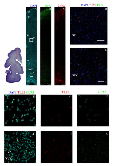 Figure 8. CUX2 is expressed in MZ, CP and SP during the peak of SP at 26 PCW. Top left shows complete scan of frontal coronal section stained for Nissl. Red box denotes place of representative confocal images shown in A–C. (A–E) Cerebral wall of the superior frontal gyrus at 26 PCW stained for CUX2 (red), marker of immature migratory neurons DCX (green), and DAPI (blue). D is higher magnification of superficial box denoted in A. E is higher magnification of lower box denoted in A. CUX2+ nuclei were found in MZ, upper part of CP and scattered along the SP (A–D). The large CUX2+ nuclei in the SP mostly do not co-localize with DCX neurons (D). Somewhat weaker CUX2+ protein expression was detected in the OSVZ (E). (F–K) Cerebral wall of the superior frontal gyrus at 26 PCW stained marker of deep layer neurons TLE4 (red) and DAPI (blue). Immunostaining was coupled to the fluorescent RNAScope® to detect CUX2 mRNA (green). CUX2 mRNA is expressed in the SP and SVZ, respectively. We did not detect co-localization of CUX2 mRNA and TLE4 in the SP, while CUX2 mRNA expression was detected in the SVZ, paralleling the protein expression. Scale bars: A, B, C = 500 µm; D, E = 100 µm; F–K = 50 µm.