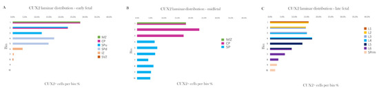 Figure 10. CUX2 laminar distribution presented as a percentage of CUX2 positive cells in the cortical compartments throughout the development. (A–C) Cortical surface area of coronal sections was segregated into ten bins, which were delineated into the actual compartments where CUX2 was expressed, by comparison to the adjacent Nissl section (MZ, CP, SPu, SPd, IZ, SVZ during early fetal period; MZ, CP, SP during the midgestation; L1–L6, SPrm during late fetal period).