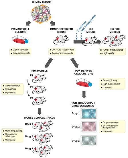 PDX are mouse models of human tumors obtained by directly grafting fresh surgical tumor fragments in immunodeficient mice. In the case of OS, the sources of tumor tissue can be biopsies, surgical resections of the primary tumor (usually after neoadjuvant chemotherapy), or resections of metastatic lesions. All can be used to establish models that represent different steps of tumor progression [].