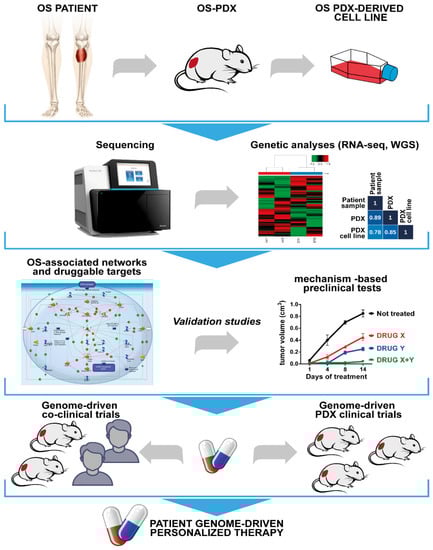 OS therapy has remained unchanged for a long time, but the recent application of multi-omic approaches made possible the evaluation of the complex and heterogeneous genetic alterations that characterize each OS. Therapeutic choices made on the basis of actionable targets identified by means of DNA sequencing have been implemented in several tumors [,]. However, systematic analysis of DNA-actionable mutations is not sufficient to guide the design of personalized treatments in OS. RNA-guided therapies should be selected when there is no actionable DNA alteration or when the DNA-selected drugs are unavailable. In addition, the extreme genetic intra- and inter-tumor heterogeneity that characterize OS, the rarity of the disease, and the frequent failures of phase I and phase II clinical trials attempted so far have prompted scientists to accept the idea that any new kind of clinical trial should be based on NGS data analysis coupled with functional studies of models that can reproduce the dynamic evolution of each individual cancer. PDXs and PDX-derived cell lines are an important platform for drug screenings. They mirror the genetic alterations of original tumors, particularly of high-risk and chemotherapy-resistant diseases, and may be useful for drug development prioritization. Since not all human OSs are able to give rise or have the chance to generate a PDX model, the use of representative, genetically well-characterized OS PDXs will produce benefits, in terms of genome-matched therapy, for OS patients sharing a similar genetic profile. The availability of large and shared repositories of PDX and PDX-derived cell lines, coupled with an extensively annotated genomic dataset of somatic oncogenic alterations of the original tumors, should be favored with the aim to offer drug response profiling as a tool for therapeutic decisions for individual patients in the clinics. Figure 2 summarizes the steps that are recommended to prospectively navigate OS patients towards therapeutic approaches guided by the principles described in this Review.