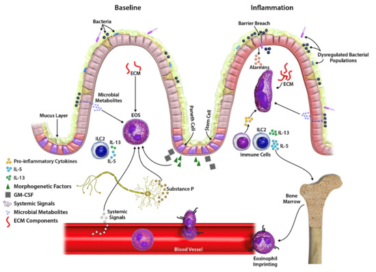 The progression of Th2 allergic conditions (e.g., atopic dermatitis, asthma and food allergies) associated with the “allergic march” is likely driven in part by systemic Th2-associated mediators [116]. Within the context of the allergic march, we recently demonstrated that the frequency and phenotype of resident intestinal eosinophils are regulated by as yet undefined signals generated through mucosal organ crosstalk along the lung:gut and skin:gut axes [67].