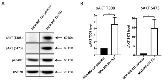 Highly metastatic triple negative MDA-MB-231 cells form metastases in bones as well as lungs, liver, ovaries, and brain in a mouse model [57] (data not shown). The bone-seeking subline MDA-MB-231 BO (hereafter, 231-BO) was generated previously using repeated intracardiac inoculation of isolated bone metastatic MDA-MB-231 cells nine times [9]. This bone-seeking breast cancer cell line shows a predilection for formation of bone metastases and a reduced dissemination to lungs or other organs compared to the parental MDA-MB-231 cell line [9] (data not shown). To investigate the role of AKT in bone metastatic breast cancer cells, we performed Western blot analysis of pAKT T308 and S473 levels in the bone-seeking cell lines. The 231-BO cells displayed a 4.7-fold higher phosphorylation of AKT at T308 and a 14.7-fold higher phosphorylation of AKT at S473 normalized to panAKT expression in comparison to the MDA-MB-231 parental cell line (Figure 1A,B). There was no significant difference in the panAKT expression among the two cell lines. These data indicate a constitutive phosphorylation and thus, constitutive activation of AKT in the examined bone-seeking breast cancer cell line.