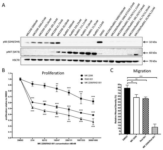 Data were analyzed using GraphPad Prism 8 (GraphPad Software Inc., San Diego, CA, USA). Combination indices (CI) for RAD001 and MK2206 combinatorial treatment were calculated with the CompuSyn software [54,55]. CI values <0.1 were grouped as “very strong synergism” (+++++) and CI values of 0.1–0.3 were grouped as “strong synergism” (++++) [56]. Outliers were determined using Grubbs’ test with an alpha of 0.05 where necessary in the in vivo experiments. Statistical significance was tested using one-way ANOVA with Dunnett’s (for comparison with one group) or Tukey’s post hoc test (for comparison with all groups) when comparing more than two groups or using unpaired two-tailed Student’s t-test or one-sample t-test with a hypothetical value of 1 when comparing two groups. Results were considered significant if p < 0.05. Each experiment was performed at least in triplicate. All figures show mean values and error bars represent SD, unless indicated otherwise.