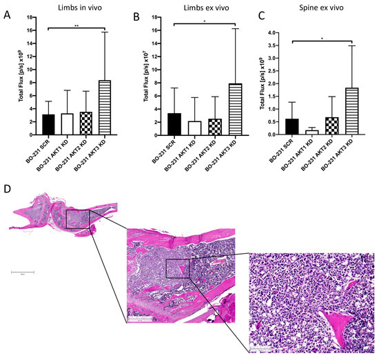Knockdown of AKT3 in 231-BO cells shows increased metastasis to bone after intracardiac inoculation in NOD scid gamma (NSG) mice: To test the effect of AKT isoform knockdowns on metastasis in an in vivo model, 231-BO cells with AKT isoform knockdowns were transduced with a luciferase vector and were inoculated into the left ventricle of NSG mice. Correct injection, tumor cell dissemination, and growth were monitored by measurement of bioluminescence. Mice were sacrificed after 21 days, exenterated, and hind limbs as well as lumbar vertebrae were harvested. Bioluminescence intensities of hind limbs of living mice (SCR and AKT1 KD: n = 16; AKT2 KD and AKT3 KD n = 18) (A), of hind limbs ex vivo (SCR and AKT1 KD: n = 16; AKT2 KD and AKT3 KD n = 18) (B), and of the spine ex vivo (SCR and AKT1 KD: n = 8; AKT2 KD and AKT3 KD n = 9) (C) were measured by an IVIS imaging system after intraperitoneal luciferin injection. Bars indicate mean with SD; * = p < 0.05, ** = p < 0.01. (D) Right hind limbs were decalcified, embedded, and histological slices were generated. HE staining was used to confirm the presence of intraosseous tumor colonization. Image represents slices from a mouse injected with 231-BO AKT3 KD cells. Scale bars represent following dimensions: left image: 2000 μm; middle image: 500 μm; right image: 100 μm.