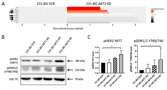 Consequently, we searched for alterations in signal transduction and kinase activities in 231-BO cells lacking AKT3 to disclose possible mechanisms that account for the promotion of migration and metastasis. Therefore, we screened the AKT3 knockdowns of the 231-BO cell line for upregulated kinase activities by performing functional kinome profiling using a PamStation®12. The resulting upstream kinase analysis predicts several kinases to be upregulated in the 231-BO AKT3 knockdown cells relative to SCR control (Figure 8A; red to light grey bars). Among the top 10 kinases, we identified the following kinases as possible mediators of enhanced migration and metastasis in AKT3 knockdown 231-BO cells: EGFR, ErbB2, ErbB4, DDR1, and DDR2. These kinases are associated with an enhanced migration, chemotaxis, and/or metastasis of breast cancer cells [12,13,59,60]. To confirm the results from kinome profiling, we analyzed the phosphorylation levels of ErbB2 (pHER2-Y877) and DDR1/2 (pDDR1/2-Y796/740) as a proof of principle by Western blotting of cell lysates from AKT isoform knockdowns of 231-BO cells. Cells with an AKT3 knockdown, but not with an AKT1 or AKT2 knockdown, showed a significantly increased phosphorylation of HER2 and DDR1/2 relative to SCR control (Figure 8B,C). Taken together, knockdown of AKT3 in bone-metastasizing 231-BO cells leads to elevated phosphorylation and activity of the pro-metastatic proteins HER2 and DDR1/2. EGFR and ErbB4 depict further kinases with an elevated activity in the AKT3 knockdown cells identified by kinome profiling.