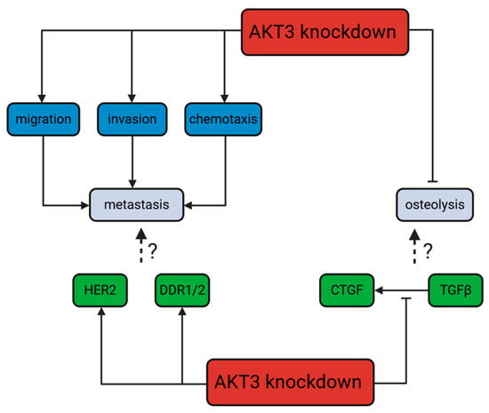 Dichotomic role of an AKT3 knockdown in 231-BO cells: promotion of metastasis but not osteolysis: On the one hand, knockdown of AKT3 increases, among others, DDR1/2 and HER2 signaling in bone-seeking breast cancer cells as well as promoting migration, invasion, and chemotaxis as steps of the metastatic process in general. HER2 and DDR1/2 activity is associated with metastasis in breast cancer in the literature. On the other hand, knockdown of AKT3 decreases the TGFβ-stimulated CTGF expression. In connection to these findings, knockdown of AKT3 leads to an absent promotion of osteolysis. The TGFβ/CTGF axis is correlated with the vicious cycle of osteolysis in breast cancer in the literature.