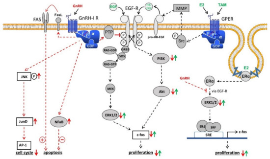 Schematic representation of GnRH-I receptor signaling in ovarian cancer cells. Binding of GnRH-I and GnRH-I analogs causes G-protein αi-mediated activation of a PTP, resulting in dephosphorylated EGF-R and inhibition of EGF-R signaling through ERK1/2 or PI3K/AKT pathway leading to reduction of proliferation. GnRH-I-induced activation of PTP also inhibits the signal transduction of GPER and membrane-associated ERα through transactivation of EGF-R. In addition, GnRH induces activation of NFκB to reduce and FAS-ligand to increase apoptosis. Finally, GnRH agonists activate the JNK/AP-1 pathway resulting in increased G0/1 phase of the cell cycle and decreased synthesis of DNA. Further details are described in the text. Abbreviations: Akt, protein kinase B (PKB); AP-1, activator protein-1; E2, estradiol; EGF, epidermal growth factor; EGF-R, EGF receptor; ERα, estrogen receptor α; ERK1/2, p44/42 mitogen-activated protein (MAP) kinase; FAS, Fas receptor; FasL, Fas ligand; GDP, guanosine diphosphate; GnRH, gonadotropin-releasing hormone; GPER, G-protein coupled estrogen receptor; GRB2, growth factor receptor-bound protein 2; GTP, guanosine triphosphate; HB-EGF, heparin-binding EGF-like growth factor; JNK, c-Jun N-terminal kinase; JunD, transcription factor JunD; MEK, mitogen-activated protein kinase kinase (MAP2K); MMP, matrix metalloproteinase; NFkB, nucleus factor kB; PI3K, phosphoinositide 3-kinase; PTP, protein tyrosine phosphatase; RAS, G-protein rat sarcoma; SOS, guanine nucleotide exchange factor “son of sevenless”; SRE, serum response element; Src, tyrosine kinase cellular sarcoma; SRF, serum response factor; TAM, tamoxifen.
