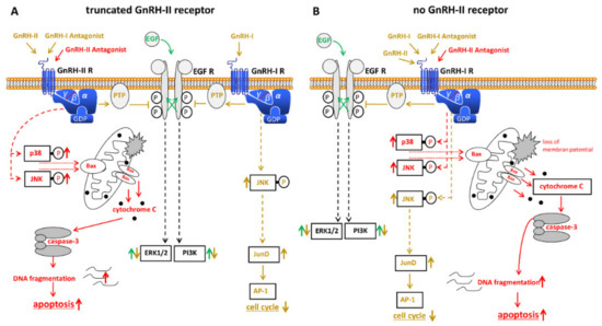 In addition to the well-known GnRH, many mammals express a second structural version of GnRH. The so-called GnRH-II is completely identical in its amino acid sequence from fish to mammal and differs from GnRH in three amino acids. A specific, functionally active receptor for GnRH-II has been found in many species. This also includes non-human primates [99,100,101,102]. Whether there is a GnRH-II receptor in humans is controversial [100,101,103,104,105,106,107,108]. There are, however, several indications for a functional GnRH-II receptor in humans [109] (Figure 2A). GnRH-II has inhibitory actions on human ovarian cancer cell proliferation that are significantly larger than those of the high active GnRH-I agonist triptorelin [104]. As well as GnRH-I agonists, GnRH-II agonists inhibit mitogenic signaling from growth factor receptors by activating a PTP. This leads to a down-regulation of the proliferation of cancer cells [55,62,110]. In contrast to GnRH-I and GnRH-II agonists and in addition GnRH-I antagonist cetrorelix, GnRH-II antagonists promote apoptosis in human ovarian cancer cells [111]. GnRH-II antagonist-induced apotosis is permitted via the intrinsic apoptotic pathway. This happens via the MAPKs p38- and JNK-induced activity of the pro-apoptotic protein Bax, followed by the loss of the mitochondrial membrane potential and subsequent cytochrome c release followed by caspase-3 activation [111,112]. Confirming these anti-tumor effects in nude mice it was shown that antagonistic analogs of GnRH-II significantly reduced the growth of human ovarian cancer xenografts in mice with no noticeable side effects [111].
