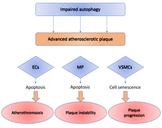 For example, abnormal autophagy in macrophages stimulates plaque instability via induced necrosis and apoptosis [31]. Cellular senescence is stimulated by the autophagy deficiency in vascular smooth muscle cells leading to accelerated plaque formation [32]. Considering endothelial cells, decreased autophagy contributes to both senescence and apoptosis in endothelial cells [33].