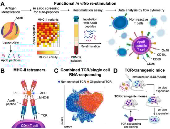 Approaches to detect Apolipoprotein B (ApoB)-specific CD4+ T cells in mice and humans. Functional restimulation with ApoB-peptides requires a peptide mapping of the entire ApoB-sequence and a selection of peptides with the highest predicted and tested affinity towards the MHC-II complex. Antigen-presenting cells are loaded with selected peptides and co-incubated with CD4+ T cells. Expression of activation markers is subsequently used to identify activated, ApoB-reactive T cells (A) Design of tetramers of MHC-II loaded with the peptide of interest. Tetramers are labelled with fluorochromes for the detection of tetramer-binding T cells in flow cytometry. (B) In simultaneous T cell receptor (TCR) and gene expression RNA-sequencing, T cells with an oligoclonal repertoire of the TCR are detected on a single cell level, which allows to selectively analyze gene expression in these cells. (C) Workflow for the generation of a TCR-transgenic mouse: peptide-specific T cells are expanded in vivo by immunization with LDL or a self-peptide from ApoB, isolated, and further expanded ex vivo by restimulation with LDL or peptide-loaded APC. Resulting clones undergo TCR-sequencing and the most promising TCR-sequences are used as templates for the generation of a TCR-transgenic mouse (D).