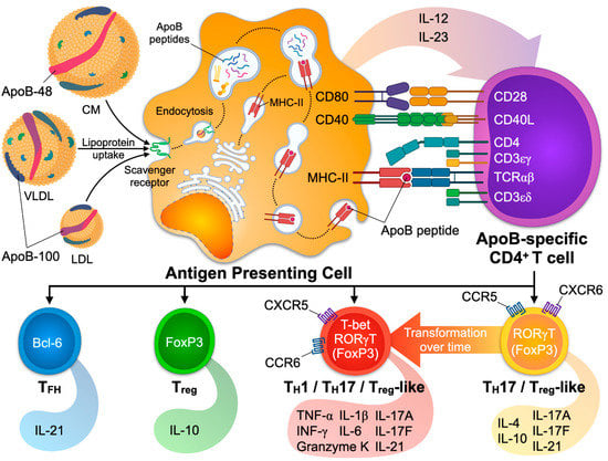 Activation and differentiation of ApoB-specific CD4+ T cells in mice. The ApoB-containing apolipoproteins LDL, VLDL, and chylomicrons (CM) are taken up by antigen-presenting cells (APCs) by endocytosis. After their intracellular processing, apolipoprotein-derived peptides are loaded on MHC-II molecules, before the entire MHC-II-peptide complex is transposed to the cell membrane. There, MHC-II-peptide complexes can be recognized and bound by a specific T cell receptor (TCR). In combination with sufficient co-stimulatory signaling events provided by the APC, a naïve CD4+ T cell is activated and may differentiate into distinct, partially overlapping TH-types of immunity: Most ApoB-specific CD4+ T cells (ApoB+) express transcriptomes and markers of TH17 and T-regulatory cells (Treg). They express CCR5 and CXCR6, two known chemokine receptors (CCRs) required for aortic homing. Over time, ApoB+ cells acquire additional pro-inflammatory transcriptional programs and express the TH1 transcription factor T-bet, as well as the CCRs CXCR5 and CCR6. The initially detectable protective Treg signature is lost in this process. After vaccination, IL-10 secreting FoxP3+ApoB+ cells have been described at the site of vaccination. In transgenic mice, only expressing a TCR that recognizes a specific ApoB-peptide, a part of ApoB+ cells differentiates into TFH that promote plasma cells generation and the production of LDL-lowering anti-LDL antibodies.