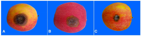 In pathogenicity tests on apples, all isolates were pathogenic. However, symptoms induced on apples by isolates of the three tested Colletotrichum species were different. Necrotic lesions induced by the C. gloeosporioides isolates were dark brown, with a definite margin and black conidiomata emerging from the surface in concentric rings (Figure 4A).