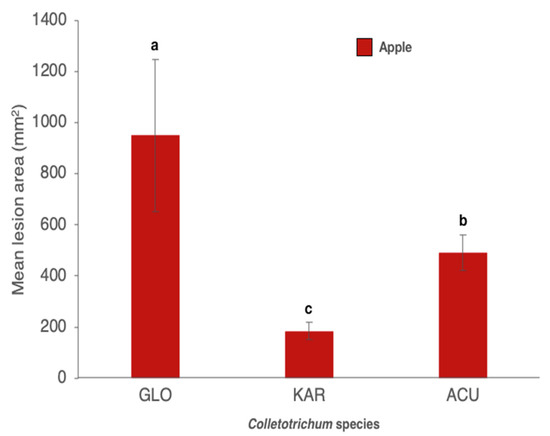 Figure 5. Mean area (± SD) of necrotic lesions (mm2) induced by Colletotrichum gloeosporioides (GLO), C. karstii (KAR) and C. acutatum (ACU) isolates on wound inoculated apples, seven d.p.i. Values sharing same letters are not statistically different according to Tukey’s honestly significant difference (HSD) test (p ≤ 0.05).