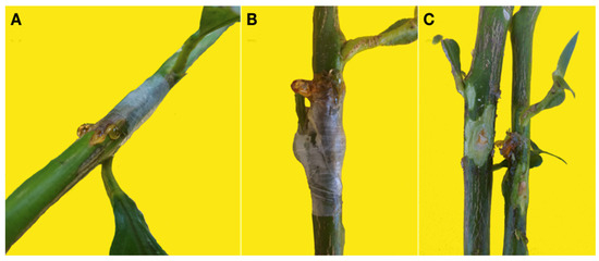 Figure 6. (A) Gumming on a twig of lemon ‘Femminello 2Kr’ wound inoculated with a Colletotrichum gloeosporioides isolate 14 d.p.i. (B) Gumming on a twig of bergamot ‘Fantastico’ wound inoculated with a Colletotrichum gloeosporioides isolate 14 d.p.i. (C) Twigs of bergamot ‘Fantastico’ wound inoculated with Colletotrichum karstii (left) and C. gloeosprioides (right) 14 d.p.i. The bark was removed to show the internal symptoms: the twig on the left shows a gum impregnation of the young xylem and a cicatricial tissue around the inoculation point while the twig on the right shows a profuse gumming extending beyond the inoculation point.