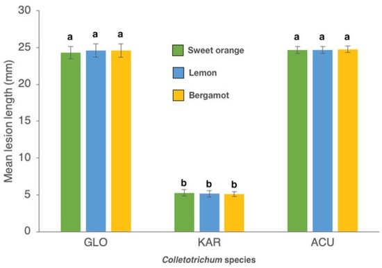 Figure 7. Mean length (mm) of necrotic lesions of six twigs per each of three replicated trees (±SD) induced by isolates of Colletotrichum gloeosporioides (GLO) (five isolates, means of 90 replicates), C. karstii (KAR) (three isolates, means of 54 replicates) and C. acutatum(ACU) (one isolate, means of 18 replicates) on in-field artificially inoculated twigs of sweet orange ‘Tarocco Scirè VCR’, lemon ‘Femminello 2Kr’ and bergamot ‘Fantastico’, 14 d.p.i. Values sharing same letters are not statistically different according to Tukey’s honestly significant difference (HSD) test (p ≤ 0.05).