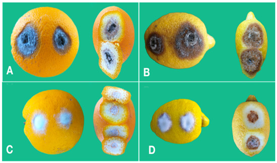 The reference isolate of C. acutatum induced quite peculiar symptoms on both sweet orange and lemon fruit as the inoculation wounds were covered by a white, cottony aerial mycelium, which masked the lesion. The necrosis extended into the albedo and reached its maximum extent 6 d.p.i., but did not expand further (Figure 8C,D).