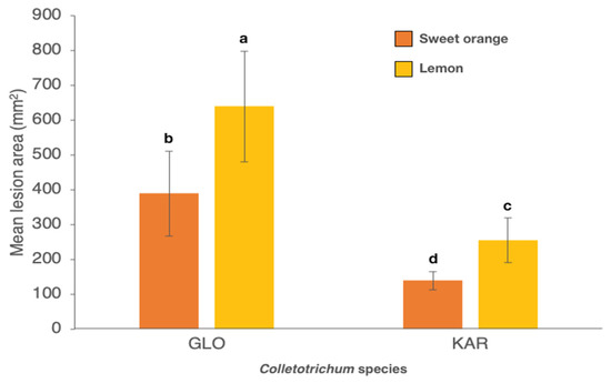 Figure 9. Mean area (mm2) of necrotic lesions (± SD) induced by isolates of Colletotrichum gloeosporioides b (GLO) (five isolates) and C. karstii c (KAR) (three isolates) a on wound inoculated fruits of sweet orange ‘Tarocco Meli’ and lemon ‘Femminello 2Kr’, 12 d.p.i. Values sharing same letters are not statistically different according to Tukey’s honestly significant difference (HSD) test (p ≤ 0.05). a Four fruits for each citrus species and two inoculation wounds per fruit. b Means of 40 replicates. c Means of 24 replicates.