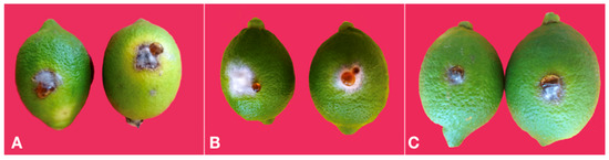 Figure 10. (A) Aerial gray mycelium and gum exudate on green fruitlets of lemon ‘Femminello 2Kr’ wound inoculated with an isolate of Colletotrichum gloeosporioides 6 d.p.i. (B) Aerial white mycelium and gum exudate on green fruitlets of lemon ‘Femminello 2Kr’ wound inoculated with the reference isolate of Colletotrichum acutatum 6 d.p.i. (C) Aerial gray mycelium and gum exudate on green fruitlets of lemon ‘Femminello 2Kr’ wound inoculated with an isolate of Colletotrichum karstii 6 d.p.i.