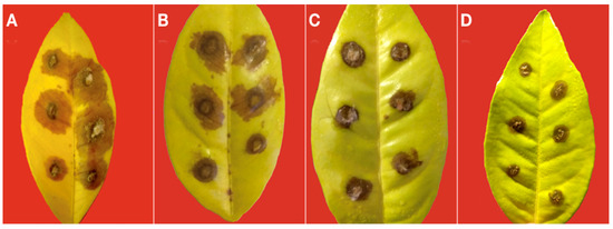 Figure 11. (A) Necrotic lesions induced by the heterologous Colletotrichum karstii isolate from camellia on wound inoculated young leaves of sweet orange ‘Navelina’ 5 d.p.i. (B) Necrotic lesions induced by the heterologous reference isolate of Colletotrichum acutatum from olive on wound inoculated young leaves of sweet orange ‘Navelina’ 5 d.p.i. (C) Necrotic lesions induced by an isolate of Colletotrichum karstii from citrus on wound inoculated young leaves of sweet orange ‘Moro’ 5 d.p.i. (D) Necrotic lesions induced by an isolate of Colletotrichum gloeosporioides from citrus on wound inoculated young leaves of sweet orange ‘Moro’ 5 d.p.i.