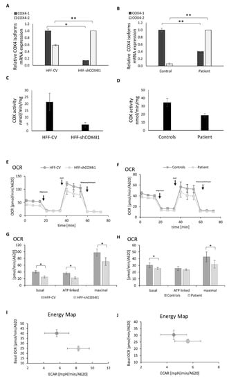 Decreased COX4I1 expression, COX activity and mitochondrial respiration with elevated glycolysis trend in COX4-1-deficient cells. mRNA expression levels of COX4 isoforms were measured by RT-qPCR in the knockdown vs. control cell lines (COX4-1 knockdown was obtained using a stable expression of COX4I1-targeting or nonmammalian-targeting shRNAs, respectively) (A) and in patient’s and healthy control fibroblasts (B). The results reveal decreased levels of COX4I1 mRNA expression and reciprocally elevated levels of COX4I2 mRNA expression in both COX4-1-deficient cells. Enzymatic activity of COX determined by spectrophotometry; shows decreased activity (C,D) in both shCOX4I1 and patient’s cells, relative to corresponding controls. Oxygen consumption rate (OCR) and extracellular acidification rate; extracellular acidification rates (ECARs) were measured in shCOX4I1 (E,G,I) and patient cells (F,H,J) and in corresponding controls, with subsequent addition of oligomycin, FCCP and antimycin/rotenone. Basal, ATP-linked and maximal OCR were calculated (G,H), and OCR was plotted against ECAR to construct energy maps (I,J). All values were normalized to cell content measured by methylene blue (A620). OCR was reduced, relative to the corresponding controls. Both COX4-1-deficient cell lines showed a tendency towards more glycolysis than the corresponding controls. Values are presented as normalized mean ± SEM; * p < 0.05 and ** p < 0.01 compared to corresponding controls.