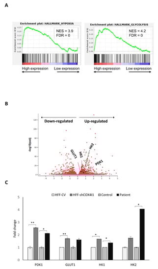 COX4 isoform 2 is mainly expressed in the lungs, and at low levels in the placenta, heart, brain and pancreas. The COX4 isoform 2 gene (COX4I2) features an oxygen responsive element (ORE), which is HIF-1-independent. COX4-2 expression is controlled by, at least, two mechanisms. That occurs either through the regulation of HIF-1 or via its ORE, where transcription is regulated by the interplay of three regulatory transcription factors: RBPJ, CXXC5 and CHCHD2 [16]. In order to identify the possible pathways that regulate the observed isoform switch, we performed CEL-Seq2 analysis of HFF-shCOX4I1 and compared the RNA expression pattern with the HFF control (with the same genetic background) from five RNA extractions performed on different occasions. The main significantly upregulated pathways were epithelial–mesenchymal transition (EMT), glycolysis and hypoxia (Figure 3A) (a list of the upregulated genes is available in the supplementary Table S1). The upregulation of glycolysis was in accord with the previously mentioned energy map showing decreased OCRs with elevated ECARs. However, the pathway that caught our attention was hypoxia, and among the potential mediators of hypoxia-induced EMT is the hypoxia-inducible factor-1α (HIF-1α), which is a transcription factor [17] linked, among many other functions, to the upregulation of COX4-2 under hypoxia [18]. In order to validate these results, and to confirm the involvement of the HIF-1α pathway, we performed RT-qPCR validations, to detect and quantify the levels of several major HIF-1 target genes. As represented in Figure 3C, we verified the upregulation of four HIF-1α target genes (including PDK1, GLUT1, HK1 and HK2) observed in the CEL-Seq2 (represented in the volcano plot: Figure 3B), which were also upregulated in both knockdown and in the patient’s fibroblasts.
