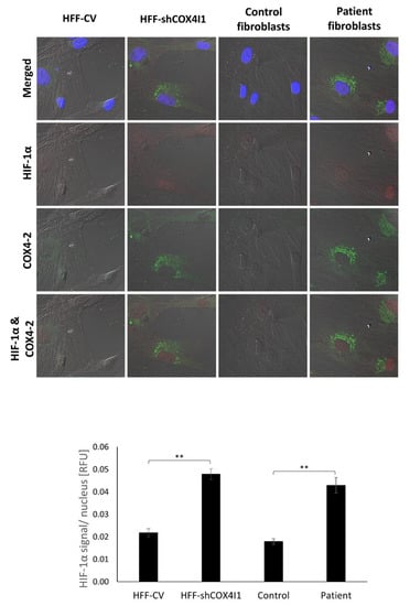 HIF-1α nuclear accumulation was present in COX4-2-positive cells. COX4-1-deficient (HFF-shCOX4I1 and patient) and control cells were stained with antibodies against HIF-1α (red) and COX4-2 (green). Nuclei were visualized by Hoechst-3334. The results demonstrate increased nuclear localization of HIF-1α in COX4-1-deficient cells relative to controls. The observed accumulation of HIF-1α was correlated with COX4-2-positive cells (upper panel). The micrographs were quantified and are depicted as histograms of HIF-1α (lower panel) relative signal intensity per nucleus ± SEM of at least 100 nuclei ** p < 0.01.