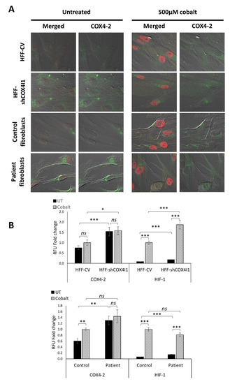 Chemical activation of HIF-1α increased COX4-2 expression in control cells, whereas in COX4-1-deficient cells, the levels remained unchanged. COX4-1-deficient (HFF-shCOX4I1 and patient) and control cells were preincubated either with or without cobalt for 6 h prior to performing co-staining of COX4-2 and HIF-1α (A). The stabilization of HIF-1α was demonstrated by its translocation to the nuclei of each treated cell. COX4-1-deficient cells did not show any difference in COX4-2 levels with and without cobalt treatment, while nuclear accumulation of HIF-1α was increased (A). The quantified results are depicted in the histogram (B). Values are normalized to the corresponding cobalt-treated controls. Mean ± SEM of at least 70 cells; * p < 0.05, ** p < 0.01, *** p < 0.001 compared to corresponding control; ns—not significant.