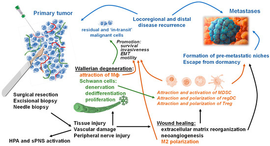 Pathways and mechanisms of accelerated locoregional and distant tumor recurrence after surgical interventions on primary tumors. Resection and biopsy cause unavoidable tissue distraction, damage of blood and lymph vasculature, and injury and trauma of the peripheral neurons. Central systemic effects of surgical stress, together with its psychological components, result in the hypothalamic-pituitary-adrenal (HPA) axis activation and stimulation of the sympathetic branch of the peripheral nervous system (sPNS). Locally, tissue injury and regional hemorrhage, followed by different levels of hypoxemic cellular stress, inflammation, and ischemia, initiate a cascade of tissue repair pathways including wound healing and Wallerian degeneration. The wound healing, after the initial hemostasis and inflammation phases, incorporates extracellular matrix reorganization for remaking new tissue, neoangiogenesis/lymphogenesis for a new network of blood/lymph vessels, and attraction and polarization of regulatory immune cells, such as macrophages (alternatively activated type 2 or M2), for resolving inflammation and augmentation of tissue and vasculature restoration. These pathways phenotypically and functionally resemble the tumor microenvironment characteristics and thus may promote reactivation of dormant malignant cells, the formation of premetastatic niches and the survival and motility of residual and “in-transit” cancerous cells. Wallerian degeneration, prompted by the axonal injury, involves Schwann cell activation–denervation, de-differentiation, and proliferation (‘repair’ phenotype), which is required for the attraction of macrophages (Mф), cleaning the myelin and dead neuronal debris, and axonal regeneration. Resent data revealed that the repair Schwann cells functionally resemble the tumor-activated Schwann cells that can attract and activate myeloid-derived suppressor cells (MDSC), attract conventional dendritic cells (DC) and polarize them into regulatory immunosuppressive DC (regDC), and attract and polarize T cells into the regulatory phenotype (Treg). This pathway also supports local and systemic tumor-associated environments, which favor the establishment and growth of local and distant micrometastases. In addition, activated Schwann cells have been reported to induce the epithelial-mesenchymal transition (EMT) of malignant cells suggesting that tumor pre-activated, as well as axon injury-activated, Schwann cells may boost motility and invasiveness of residual and “in-transit” cancerous cells supporting the formation of the locoregional and distant metastases after surgical excision of primary tumors. (Cancerous cells and their migratory pathways are shown in blue font and blue arrows; immune cells and their effects on malignant cells are shown in brown font and brown arrows; neuroglial Schwann cells and their effects on immune and malignant cells are shown in green font and green arrows. Common pathways connected with primary tumor invasive procedures and tissue injury and repair, and their influences on malignant, neuroglial, and immune cells are shown in black font and black arrows.).