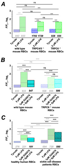 Wang, J.; Hertz, L.; Ruppenthal, S.; El Nemer, W.; Connes, P.; Goede, J.S.; Bogdanova, A.; Birnbaumer, L.; Kaestner, L. Lysophosphatidic Acid-Activated Calcium Signaling Is Elevated in Red Cells from Sickle Cell Disease Patients. Cells 2021, 10, 456. https://doi.org/10.3390/cells10020456