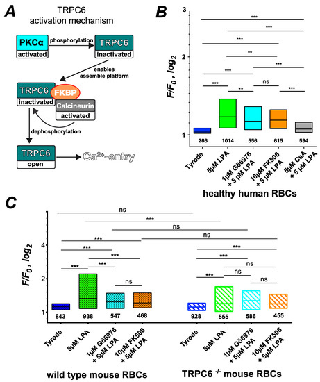 - Foller, M.; Kasinathan, R.S.; Koka, S.; Lang, C.; Shumilina, E.V.; Birnbaumer, L.; Lang, F.; Huber, S.M. TRPC6 Contributes to the Ca(2+) Leak of Human Erythrocytes. Cell Physiol. Biochem. 2008, 21, 183–192. [Google Scholar] [CrossRef]