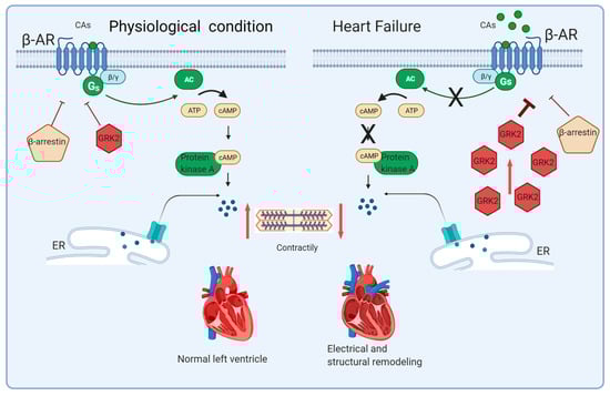 Graphical representation of β-AR signaling in the physiological condition (left) and heart failure (right). In the physiological condition (left panel), β-AR stimulation by CA results in the dissociation of the stimulatory G-protein α-subunit (Gαs) from Gβγ. Gαs stimulates adenylate cyclase (AC) to produce cAMP, which leads to increased contractility by activating the protein kinase A (PKA). The G protein-coupled receptor kinase (GRK2) translocates to the membrane and phosphorylate agonist-bound β-AR, leading to the decoupling of the G protein. Finally, β-arrestins bind the complex, triggering receptor internalization and downregulation. In heart failure (right panel), the increase in CA levels determines the β-AR hyperactivation and consequent GRK2 upregulation, which, in the long term, results in β-AR dysfunction. (AC, adenylate cyclase, ATP, adenosine triphosphate, CAs, catecholamines, β-Ars, β-adrenergic receptors, cAMP, cyclic adenosine monophosphate, ER, endoplasmic reticulum, GRK2, G protein-coupled receptor kinase 2, and Gs, stimulatory G protein). Created with BioRender.com.