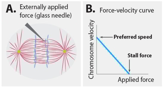It seems clear that the speed of chromosome motion in anaphase is set by a speed governor. The presence of a speed governor has strong implications for the mechanism of chromosome segregation, as will be elaborated in more detail below. However, the mechanics of speed governors can be quite counterintuitive. Consider Nicklas’ classic measurement in more detail [20]. Nicklas used a calibrated glass needle to apply known forces to resist the motion of segregating chromosomes in anaphase (Figure 3A). In the absence of an applied force, the chromosomes moved at their preferred speed. The greater the force that Nicklas applied, the slower the chromosomes moved. Thus, there is a relationship between applied force and velocity, which can be represented by a force–velocity curve (Figure 3B). Since the total force acting on the chromosome is always zero (because of force balance), when Nicklas applied a higher force to the chromosome with his glass needle, the spindle must have applied a correspondingly higher force in return to keep the chromosome in motion. When the applied force was high enough, ~700 pN, the chromosomes ceased to move. This force, i.e., the applied force necessary to stop all motion, is known as the stall force. Thus, the spindle can exert up to ~700 pN on a single chromosome. What does this experiment say about the magnitude of force that the spindle exerts on a chromosome during unperturbed anaphase (i.e., in the absence of additional forces from the glass needle)? Absolutely nothing. Instead, this experiment informs us about the additional forces that the spindle can produce beyond those that it normally does. Hypothetically, the force that the spindle normally produces could be determined by measuring the tension in all load-bearing linkages in an unperturbed spindle [64,65,66], but this is a fundamentally different question than that addressed by Nicklas’s experiment.