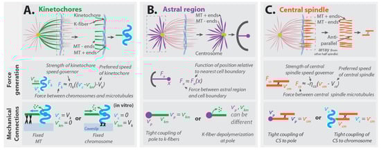 ((A), top) A coarse-grained mechanical model of kinetochore forces and K-fibers, which are bundles composed of kinetochore microtubules. ((A), middle) Kinetochores apply forces between chromosomes and kinetochore microtubules, . This force depends on the extent to which the relative velocity of chromosomes, , and kinetochore microtubules, , differs from the kinetochore’s preferred speed, . ((A), bottom) In vitro movement of the microtubules and chromosomes is dependent on which mechanical linkages are present. ((B), top) A coarse-grained mechanical model of the astral region forces. ((B), middle) The astral region applies forces between the pole and the cell boundary, . This force depends on the distance between the pole and the cell boundary, . ((B), bottom) Two different possible couplings with implications for the relationship between the velocity of kinetochore microtubules, , and the velocity of spindle poles, . ((C), top) A coarse-grained mechanical model of central spindle forces. ((C), middle) The central spindle applies a force between the central spindle microtubules, . This force depends on the extent to which the velocity of the central spindle microtubules, , differs from the central spindle’s preferred speed, . ((C), bottom) Two different possible couplings of central spindle microtubules: either tightly coupled to chromosomes or tightly coupled to poles.