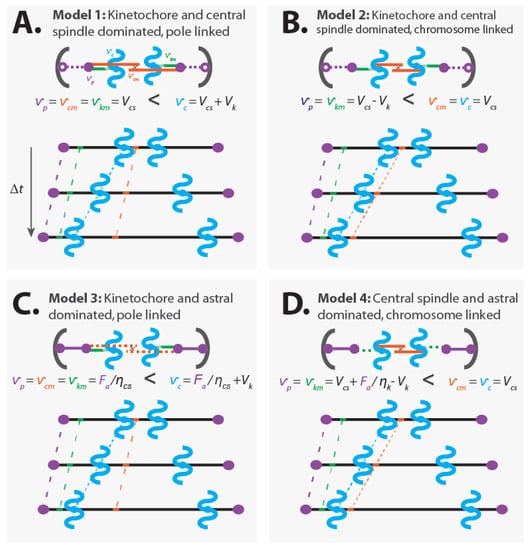 The manner and extent to which central spindle forces impact chromosome segregation depends on how the central spindle is connected to chromosomes. In smaller spindles, such as those in yeasts, central spindle microtubules are believed to primarily couple to spindle poles [7]. Such a tight connection naively suggest that the velocity of the poles, , is the same as the velocity of the central spindle microtubules, , giving (Figure 4C, bottom right). This implies that the influence of the central spindle on chromosomes is indirect, and only occurs through their mutual interactions with the spindle pole. In larger, metazoan spindles, micromanipulation [76], laser ablation [77,78,79,80], and structural studies [25,29,49] indicate that non-kinetochore microtubules strongly interact with kinetochore microtubules throughout their length, including very close to the kinetochore itself. In those spindles, it may be more accurate to approximate the central spindle microtubules as being linked directly with the kinetochore (or chromosomes) than as being connected to the pole. This scenario implies that the velocity of the chromosomes, , is the same as the velocity of the central spindle microtubules, , giving (Figure 4C, bottom left).