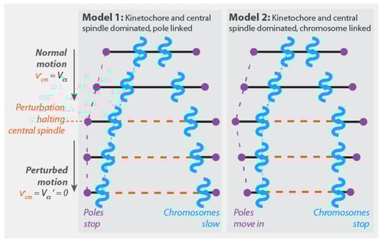 Experimental perturbations can be used to differentiate between different mechanical models of anaphase. For a perturbation that selectively halts the motion of the central spindle microtubules (i.e., by causing the preferred speed of the central spindle microtubules, , to become zero, ), Models 1 and 2 (Figure 5A,B) both predict that the speed of the central spindle microtubules, , becomes zero (i.e., ). However, this change leads to different subsequent motions of chromosomes and poles in the two models. In Model 1, this perturbation causes spindle poles to cease moving, while chromosome motion continues (at a reduced rate). In Model 2, this perturbation causes chromosomes to cease moving. In both Models 1 and 2, this perturbation is predicted to have no impact on the relative motion of chromosomes and poles.