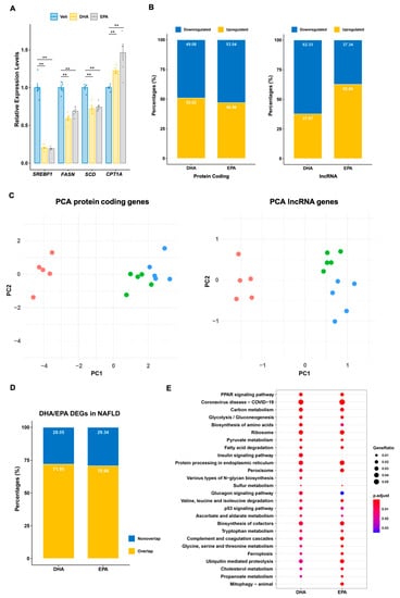 Nutrigenomic response to omega-3 fatty acid in human hepatocytes. (A) Expression of genes involved in de novo lipogenesis and fatty acid oxidation after 16h treatment with 200 µM DHA or EPA. Number of replicates = 5, error bar represents SEM, ** p < 0.001, two-tailed unpaired Student’s t-test. (B) Composition of differentially expressed genes responding to DHA or EPA. Bar charts representing the percentages of protein coding (left) or lncRNA (right) DEGs up or downregulated by DHA or EPA. (C) PCAs of expressed protein coding (left) and lncRNA (right) genes in primary hepatocytes in response to DHA/EPA/vehicle. (D) Relevance of n-3 PUFA DEGs in NAFLD. Percentage of n-3 PUFA responsive genes differentially expressed in NAFLD. (E) GO term analyses for n-3 PUFA responsive genes differentially expressed in NAFLD.