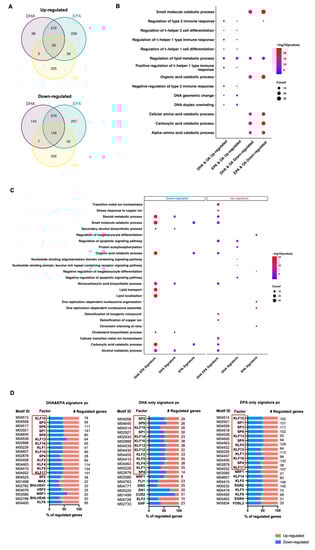 Although most processes enriched in DHA- and EPA-regulated genes specifically are also affected by both DHA and EPA, we were able to reveal specific functions of DHA and EPA. For example, we identified upregulated protein autophosphorylation and negative regulation of apoptotic signaling pathways in response to DHA, and DNA replication related nucleosome assembly and organization in response to EPA (Figure 2C).