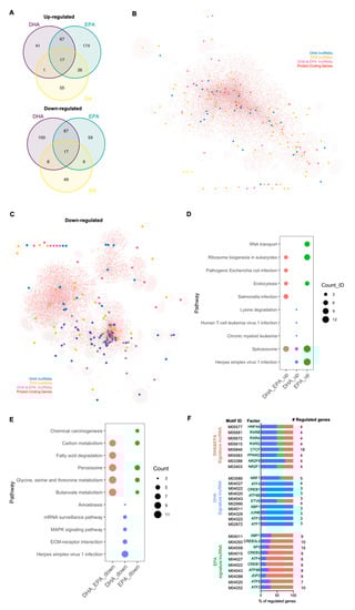 Recent works, including ours, have demonstrated that lncRNAs play important roles in metabolism regulation [,,,]. To explore the potential function of these signature lncRNAs, we performed lncRNA–mRNA correlation analysis between each individual signature lncRNA and protein coding gene in human liver (GTEx dataset). Networks of lncRNA and their highly correlated protein coding genes were constructed to reveal their association. Despite some clustering, the distribution of majority hub lncRNAs is quite distinct, suggesting shared and specific functions among each group of signature lncRNAs (Figure 3B,C). To further infer the function of a specific group of signature lncRNAs, pathway enrichment analysis was performed based on highly correlated hepatic coding genes and the top 5 most enriched pathways for each group of signature lncRNAs were calculated accordingly. As shown in Figure 3D, for upregulated signature lncRNAs, either DHA and EPA coregulated, DHA or EPA specifically regulated lncRNAs were predicted to have potential roles in RNA splicing, ribosome biogenesis, and endocytosis. Interestingly, DHA- and EPA-regulated lncRNAs could be related to pathogen infections, with DHA and EPA coregulated lncRNAs involved in bacterial infection response, while DHA and/or EPA specific lncRNAs, instead, are involved in viral infection response. For downregulated signature lncRNAs, the potential functions are similar between DHA and EPA coregulated and EPA specifically regulated lncRNAs including pathways related to peroxisome and amino acid metabolism, while DHA-regulated lncRNA has some unique functions such as MAPK signaling and ECM–receptor interaction (Figure 3E).