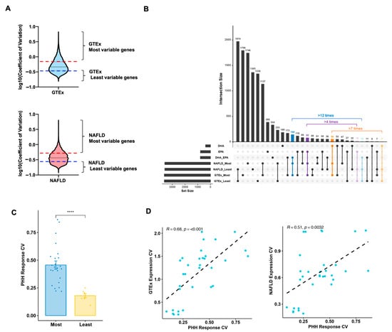 Selection of biomarker genes contributing to individual variation in hepatic response to DHA/EPA. (A) Defining genes with most or least expression variability in general (GTEx) or relevant disease (NAFLD) populations. (B) Selection of signature genes displaying high population expression variability in general (GTEx) and relevant metabolic disease (NAFLD) populations, while signature genes with least population expression variability in human populations served as negative controls. Here, the UpSet plot summarized the intersections of each group of signature genes and the most or least variable hepatic genes in general/relevant disease populations. (C) Response coefficient of variation (CV) for signature genes with high expression variability was significantly higher than those exhibiting low expression variability in human populations. Coefficient of variation was calculated to represent the response variability based on their responses across a panel of 10 donors. **** p < 0.001, two-tailed unpaired Student’s t-test was performed to compare most variable versus least variable signature genes. (D) Correlation of coefficient of variation between the expression in general/relevant disease populations and responses in PHH (Primary human hepatocytes) were plotted.