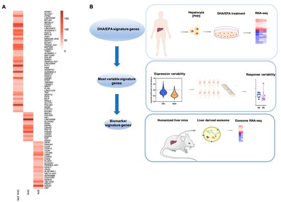 Detection of transcripts for DHA/EPA biomarker genes in liver-derived exosomes in circulation. (A) Detection of biomarker signature genes in humanized liver-derived exosomes by intersection of the top 20% human genes with the highest expression level (based on count value) in humanized liver-derived exosome with highly variable signature genes. (B) A road map defines biomarker genes representing interindividual variations of hepatic responses to DHA/EPA.