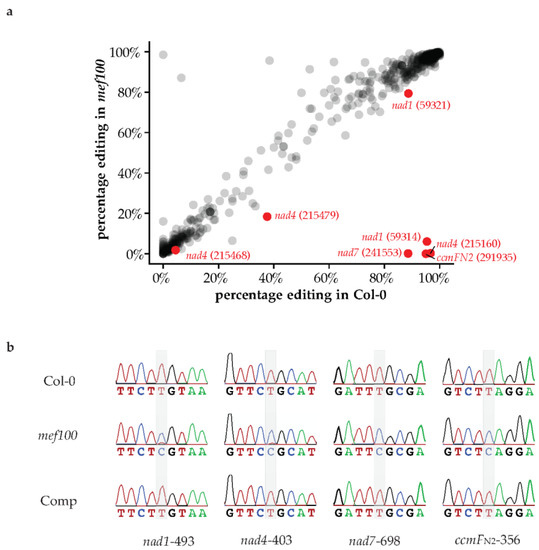 Targeting prediction software predicts that MEF100 is targeted to mitochondria (TargetP: 0.935, Predotar: 0.48) [30,31]. The fact that mef100 was isolated in a screen for mutants insensitive to BSO [20] suggests that MEF100, a DYW-PPR protein, could be acting in the mitochondrial compartment as an RNA-editing factor. Therefore, we searched for mitochondrial RNA editing events that showed severely reduced levels of editing in the mef100 mutant by sequencing RNA from isolated mitochondria. Approximately 10 million reads were obtained by RNA-seq from each sample and mapped to the Arabidopsis organelle genomes. Of these, 1.01 M reads mapped to the mitochondrial genome in the wild-type sample and 8.97 M reads mapped to the mitochondrial genome in the mef100 sample. The RNA nucleotides mapping to each position were counted to analyse RNA editing. Using a Fisher exact test, we identified seven sites that were differentially edited in the mef100 mutant as compared with Col-0. Four sites showed dramatic decreases of editing in mef100: nad1-493 (genome position 59,314), nad4-403 (215,160), nad7-698 (241,553) and ccmFN2-356 (291,935), from 85–99% editing in Col-0 to 0% editing in the mef100 mutant, except for the nad1 site, which showed residual editing in mef100 (Figure 2a,b and Table 1). The lack of editing at these sites in the mef100 mutant strongly suggests that the MEF100 protein acts as the specificity factor for the editing reactions at these sites. Small but significant decreases were observed at three additional positions (nad1-500 (59,321), nad4-95 (215,468) and nad4-84 (215,479)), but we do not believe these sites are direct targets of MEF100 (see Section 4).