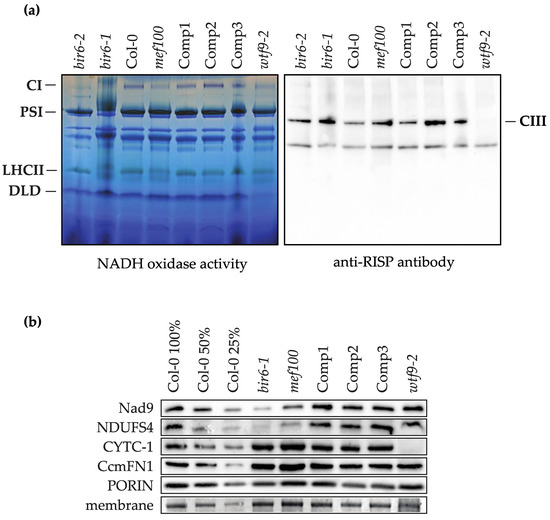 Analysis of mitochondrial respiratory complexes in mef100 as compared with the bir6-1 and wtf9-2 mutants impaired in Complex I and III respectively, Col-0 and complemented plants (Comp1, 2, 3). (a) BN-PAGE analysis of total membrane extracts: Complex I (CI) and dihydrolipoamide dehydrogenase (DLD) activity bands are indicated on the BN gel (left panel) as well as photosystem I (PSI) and light harvesting complex II (LHCII). Complex III (CIII) is shown on a Western blot probed with an anti-RISP antibody. (b) Western blot analysis using antibodies against two subunits of Complex I (Nad9 and NDUFS4), CYTOCHROME C1 (CYTC-1) and CcmFN1, a subunit of the CCM complex. The anti-porin antibody and a stained membrane were used as loading controls. The full images of the membranes are shown in Figure S2.