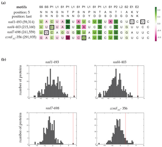 RNA target predictions for MEF100 according to the PPR code. (a) Scores of the MEF100 PPR motifs with the ribonucleotide sequences upstream of its target sites. The edited C is in last position in all four sequences. Motifs were aligned such that the E2 motif was aligned with the nucleotide two positions upstream of the edited C. Matches and mismatches of a PPR motif with the aligned nucleotide according to the PPR-RNA binding code are shown in green and magenta, respectively. The opacity is proportional to the strength of the correlation. The editing sites found upstream of the sites edited by MEF100 are indicated by a square. (b) Distribution of prediction scores for the MEF100 target sites aligned with 205 PLS-PPR proteins. Red lines indicate the prediction for the target sites aligned with MEF100.