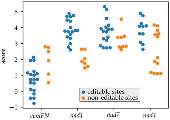 We scored how well different putative MEF100 orthologues were predicted to bind the four potential targets in their respective mitochondrial transcriptomes (Figure 5). For two sites (nad1-493 and nad4-403), the sequences scored significantly higher in species where the site is editable than in species where the site is not editable.