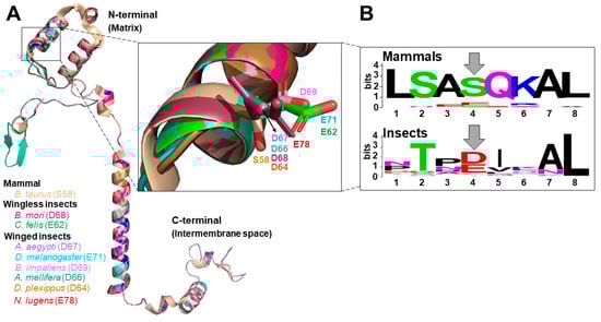 The tridimensional structure models of insects COXIV. (A) Overlay of eight structures of COXIV from insects modeled using the Phyre 2 server, using the primary sequence as input, normal modeling mode and the Bos taurus crystal structure (PDB: 1V54) as a template [171]. All structures were aligned from the mitochondrial matrix N-terminal on the top to the C-terminal at the intermembrane space at the bottom. The structures were analyzed using Pymol software and colored as shown in the figure. The conserved Asp (D) and Glu (E) residues in the α1-helix of insects COXIV are highlighted and shown in the inset box. Note that the only Ser residue (Ser58) identified is from B. taurus. (B) WebLogo diagram of α1-helix region close to mammalian Ser58 identified by the grey arrow. WebLogos of other insect COXIV regions containing known P-sites [172] are identified by the grey arrow. The WebLogos used the multiple alignment from 22 sequences from 19 mammals and 38 sequences of 21 insect species. Note the conserved Ser residue in the position 4 for mammals, equivalent to Ser58 [150], while for most insects this residue is exchanged for a Glu or Asp at the same position.